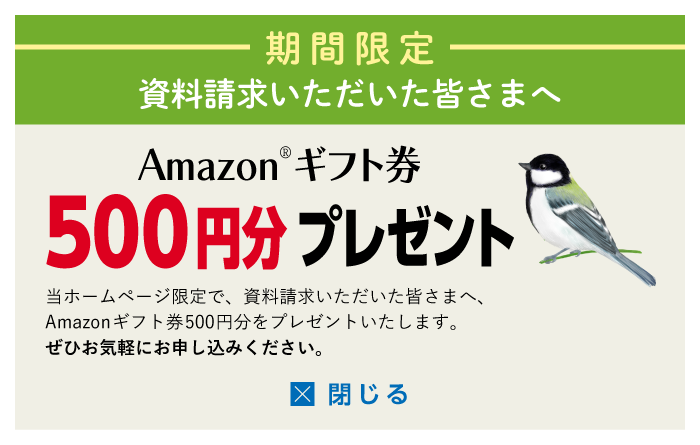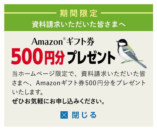 当ホームページ限定で、資料請求いただいた皆さまへ、Amazonギフト券500円分をプレゼントいたします。